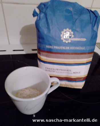Dazu habe ich in einer kleinen Tassen 15 g Laufener Landweizen-Mehl mit 15 ml Wasser vermischt. Das ist recht wenig, ich weiß. Wenn Sie also mehr backen wollen, dann nehmen Sie 30 oder 50 g Mehl mit der gleichen Menge Wasser.