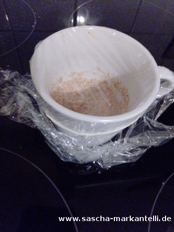 Die Tasse wird dann mit Frischhaltefolie abgedeckt, mit einem Gummiband fixiert und dann an einem warmen Ort in Ihrer Wohnung hingestellt. Dort bleibt die Tasse mindestens 3 Tage stehen.