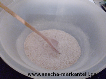 150 ml lauwarmes Wasser + 3/4 EL Flohsamenschalen