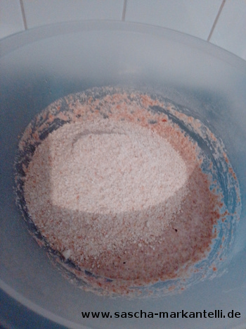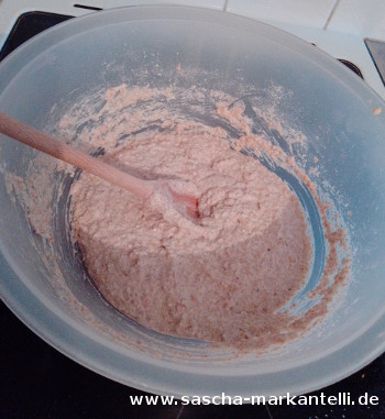 Sie können auch erst die trockenen Zutaten vermischen und dann alles zusammen zu den Sauerteig geben und gut verrühren. Wichtig ist nur, dass Alles gut verrührt ist, sonst besteht das Brot nachher aus größtenteils abgetrennten Mehlsorten. Das sieht nicht nur unschön aus, sondern könnte die Konsistenz des Brotes etwas ungünstig machen.