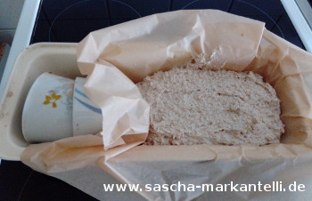 Auch hier gilt wieder: Meine Kastenform hat eine Breite von 11 cm Innendurchmesser. Auf der Länge trenne ich die Form dann so ab, dass das Brot ca. 15 cm lang wird. Oder sagen wir mal so: Bei der Herstellung habe ich hier die Kastenform auf 17 cm Länge abgetrennt. Nach dem Backen habe ich mir aber so gedacht, dass 15 cm wohl besser gewesen wäre. Also: Wenn ihre Form auch 11 cm Innendurchmesser hat, dann trennen Sie lieber auf 15 cm ab.