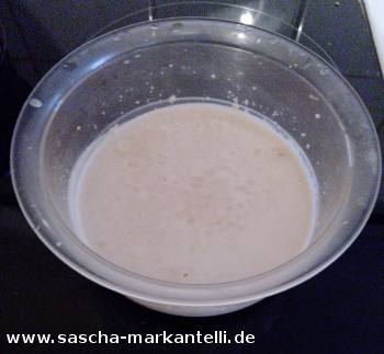 Bevor Sie die Mehle mischen, geben Sie in eine kleines Schälchen die halbe Packung Trockenhefe zusammen mit dem TL Zucker. Darauf kommt dann 100 ml warmes Wasser. Rühren Sie alles gut um, damit sich die Hefe und der Zucker gut auflösen können. Stellen Sie das Schälchen nun zur Seite.