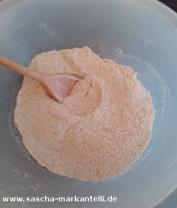 Während Sie die Zutaten dazu geben, darf auch nicht zwischendurch umgerührt werden - erst zum Schluss, wenn alle Mehle in der Schüssel sind. Genaues dazu erfahren Sie in der Beschreibung.