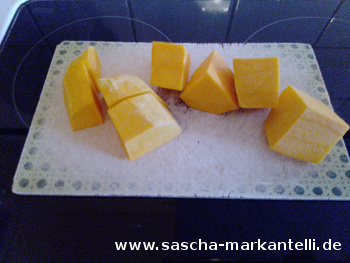 Vom Gewicht her sollte dieser im noch unverarbeiteten Zustand, jedoch aber ohne Kerne und bereits geschält ungefähr 250 g wiegen. Dazu habe ich von den Butternut-Kürbis einfach den obersten Teil der "Birnenform" abgeschnitten (welcher ja kaine Kerne enthält), geschält und dann gewogen. Vom Gefühl her dachte ich dann: "Das wird schon passen". :-)