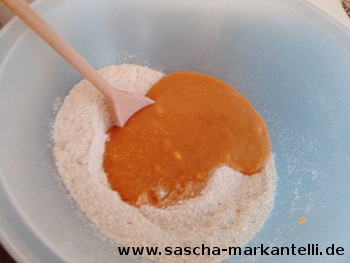 Aber das ist nicht schlimm: Geben Sie erst einmal den Brei in die Schüssel zu den trocknen Zutaten.