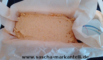 So denn: Nun nehmen Sie die Kastenform (meine hat die Innenmaße 11 x 30 cm) und trennen Sie diese Form mit einer kleinen Tasse ab und stopfen Sie dann das Backpapier dort hinein. Übrig bleibt eine Länge von ca. 22 cm.