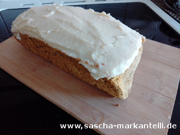 Ist der Kuchen abgekühlt, können Sie die Creme zubereiten. Einfach alle Zutaten in einer kleinen Schüssel mit einem Schneebesen verrühren. Die Masse dickt recht schnell an und kann dann oben auf den Kuchen verstrichen werden.