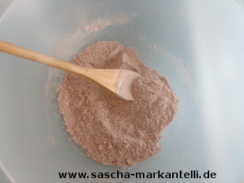 Dann geben Sie auch hier das Wasser dazu, verrühren alles und lassen Sie den Teig kurz nachquellen.
