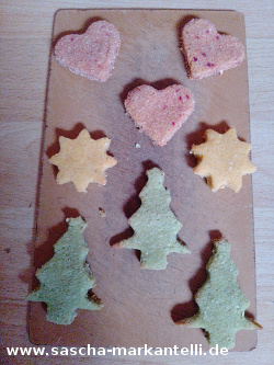 Jetzt sind keine weiteren Versuche mehr notwendig. Ich musste halt nur noch so nach und nach die Plätzchen-Varianten (siehe Weihnachtsbäckerei) austesten, was die Wassermenge angeht. Und genau das habe ich gemacht und kann die Rezepte hier nun alle niederschreiben.