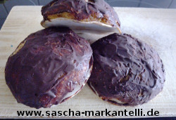 Dann nehmen Sie die 25 vegane Zartbitterschokolade und schmelzen diese in ein warmes Wasserbad. Streichen Sie nun die Schokolade insgesamt über die 4 Lebkuchen. Es ollte genau für 4 Stück reichen, damit diese gut mit einer Schokoladenschicht bedeckt sind. Eventuell können Sie auch am Rand des Oblats von unten vorsichtig ewas Schokolade drum herum schmieren, um das Oblat noch einmal richtig fest zu machen. Wie auch immer. Lassen Sie auch jetzt wieder alles auskühlen und verhärten. Eventuell können Sie die Lebkuchen auch im Kühlschrank stellen, damit die Schokolade schneller fest wird.