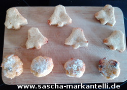 Und das gilt aber nur für das "Natur-Rezept". Bei den anderen Rezepten, die später noch kommen, wo z.B. noch Kakao-Pulver, Carob-Pulver oder andere Zutaten dazu kommen, können Sie dann pro Rezept noch mehr Plätzchen fertig machen, teilweise bis zu 15 oder 16 Stück.