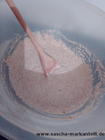 Sie können auch erst die trockenen Zutaten vermischen und dann alles zusammen zu den Sauerteig geben und gut verrühren. Wichtig ist nur, dass Alles gut verrührt ist, sonst besteht das Brot nachher aus größtenteils abgetrennten Mehlsorten. Das sieht nicht nur unschön aus, sondern könnte die Konsistenz des Brotes etwas ungünstig machen.