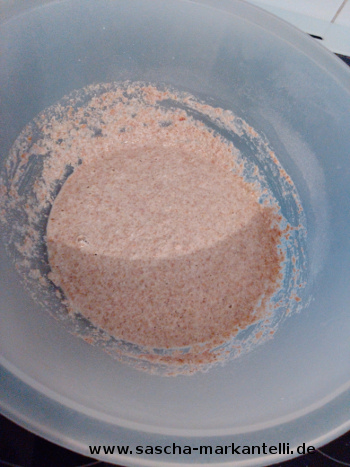 Ist der Sauerteig fertig, dann beginnen Sie den Vorteig vorzubereiten - am besten Abends, 1 Tag bevor Sie das Brot fertigstellen wollen. Denn dann kann der Vorteig über Nacht stehen bleiben, weiter säuern, und am nächsten Morgen können Sie dann den Rest erledigen und das Brot backen.