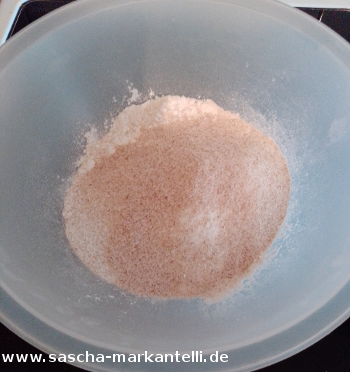 Jetzt nehmen Sie die große Schüssel, wo Sie die anderen Zutaten für das Brot mischen wollen. Wie schon oben gesagt, müssen Sie jetzt die Reihenfolge der Mehle so beibehalten wie sie hier in der Liste stehen. Das heisst: Sie geben zuerst die gemahlenen Hirseflocken in die Schüssel, dann die 50 g Kartoffelstärke, dann die gemahlenen Haferflocken, dann Reismehl. Jetzt können Sie das Salz hinzugeben und - wenn Sie wollen - ein paar Gewürze wie z.B. Koriander, Kümmel, etc. Nun geben Sie wieder Kartoffelstärke hinzu (25 g) und das Buchweizenmehl. Darauf kommt dann die 15 g Flohsamenschalen.