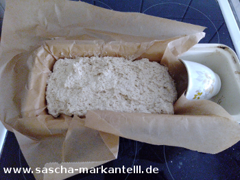 Was auch immer Sie vorhaben, geben Sie nun den Teig in die mit einem Backpapier ausgekleidete Form und stellen Sie das Form nun in den Ofen. Schalten Sie den Ofen auf kleinste Temperatur (50 Grad). Wenn Sie das Brot abdecken (aber so das es noch oben noch aufgehen kann), dann können Sie die Ofentür ein Spalt weit offen lassen (Holzlöffel dazwischen stecken). Wenn Sie es nicht abdecken, dann schließen Sie die Ofentür (damit es kein Zug geben kann) und lassen den Ofen ca. 20 Minuten bei 50 Grad laufen und schalten diesen dann aus.
