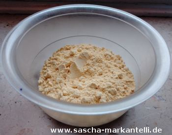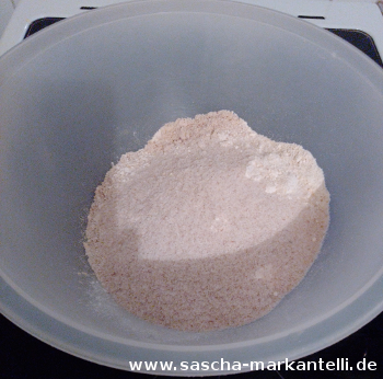 Zunächst einmal geben Sie alle trockenen Zutaten nacheinander - so wie in der Liste aufgeführt - in einer Schüssel hinein. Sie rühren aber noch nichts um, sondern geben die Zutaten einfach übereinander in die Schüssel.