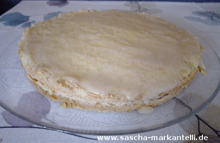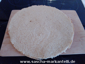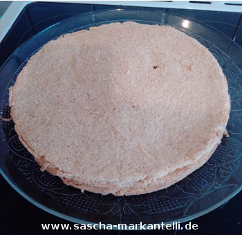 Nun, man könnte jetzt denken, dass man den Teig doch als Ganzes backen kann und dann einfach 3 mal quer durchschneiden könnte. Ja.. da ist aber nicht so einfach. Tatsächlich habe ich das auch erst genauso versucht, aber habe es geschafft nur 3 Böden hinzugekommen, bzw.. den Teig nur 2 mal durchgeschnitten. Und dabei ist mir der mittlere Teig etwas kaputt gegangen. Also, es ist wirklich besser und wesentlich einfacher die Böden einzeln zu backen - so wie ich es hier vorgestellt habe. Vor allem bekommt man die Böden dann auch wirklich schön gleichmäßig und gleich groß hin, ohne dabei kaputt zu gehen. Im Gegenteil, die Teigböden halten schöen fest zusammen. Trotzdem ist der Teig angenehm locker und leicht zu essen. Also, machen Sie es lieber so, wie hier beschrieben. Was anderes wäre es, wenn wir nur 2 Böden bräuchten. Dann wäre das kein Problem den Teig durchzuschneiden. Aber bei 4 Böden muss man schon sehr genau arbeiten.