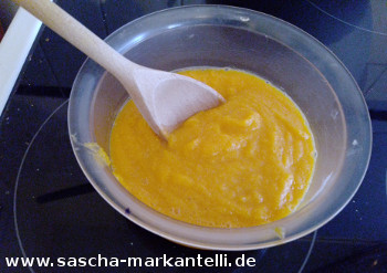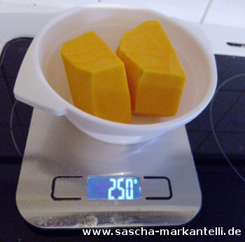 Vom Gewicht her sollte dieser im noch unverarbeiteten Zustand, jedoch aber ohne Kerne und bereits geschält ungefähr 250 g wiegen. Dazu habe ich von den Butternut-Kürbis einfach den obersten Teil der "Birnenform" abgeschnitten (welcher ja kaine Kerne enthält), geschält und dann gewogen. Vom Gefühl her dachte ich dann: "Das wird schon passen". :-)