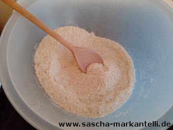 Holen Sie die Stücke anschließend aus dem Ofen und legen Sie diese erst einmal beiseite. Kümmern wir uns jetzt erst einmal um den Teig. Dazu mischen Sie einfach alle trockenen Zutaten aus der Zutatenliste in einer Schüssel nach und nach zusammen. Das heißt, die geben die Zutaten nach und nach hinein, und dann erst verrühren Sie alles gut miteinander.