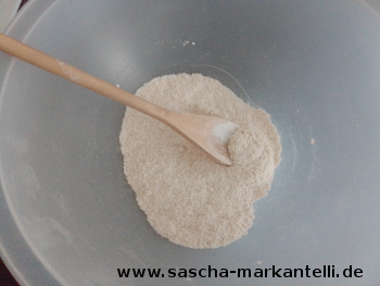 Dann geben Sie auch hier das Wasser dazu, verrühren alles und lassen Sie den Teig kurz nachquellen.