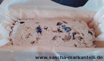 Meine Kastenform hat die Maße 11 x 30 cm (Innenmaß). Der Kuchen kann dieses Mal tatsächlich in die ganze Form hinein gegeben werden - ohne Abtrennung.